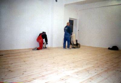 Verlegen von Lagerholz, Dielem, Ziehklingen, Spachteln, Befestigen der Leisten, Polieren, dreimaliges Ölen mit einer Poliermaschine.